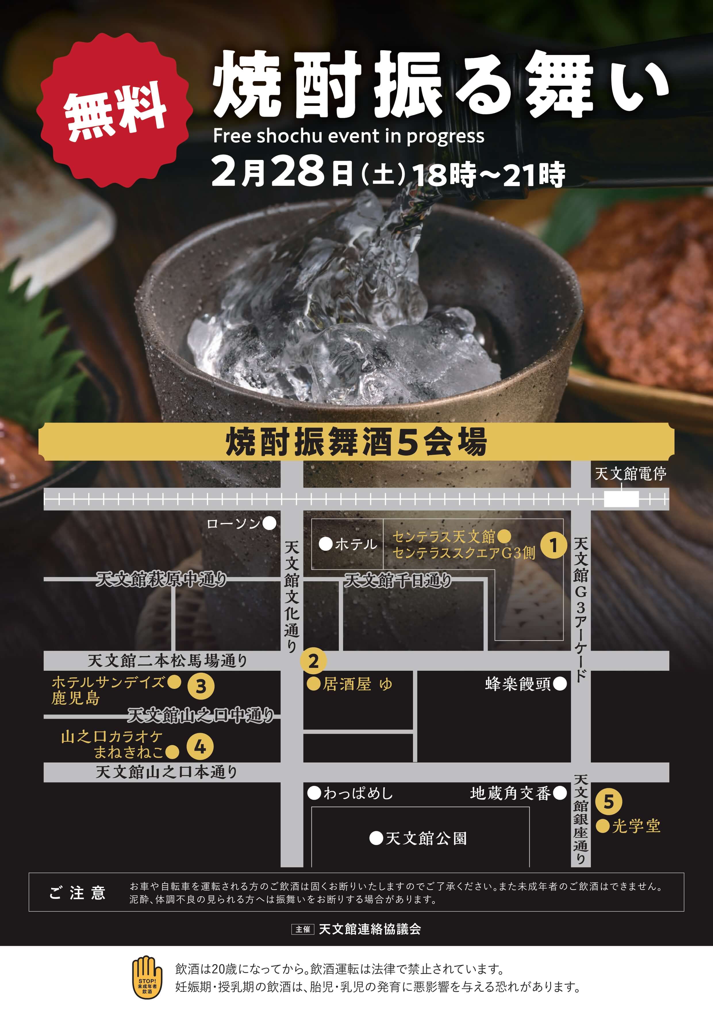 「鹿児島マラソン協働事業」のお知らせです。 天文館連絡協議会より、大会前日の焼酎振る舞いのご案内です。 詳細等につきましては、チラシをご確認ください。